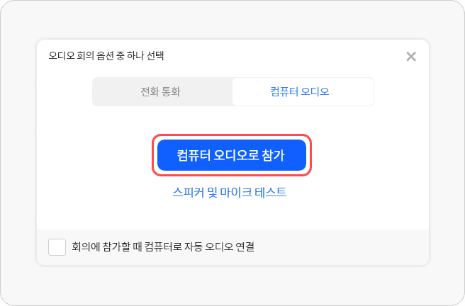 컴퓨터 오디오로 참가 버튼클릭, 스피커 및 마이크 테스트 진행