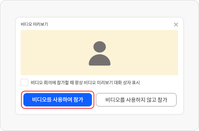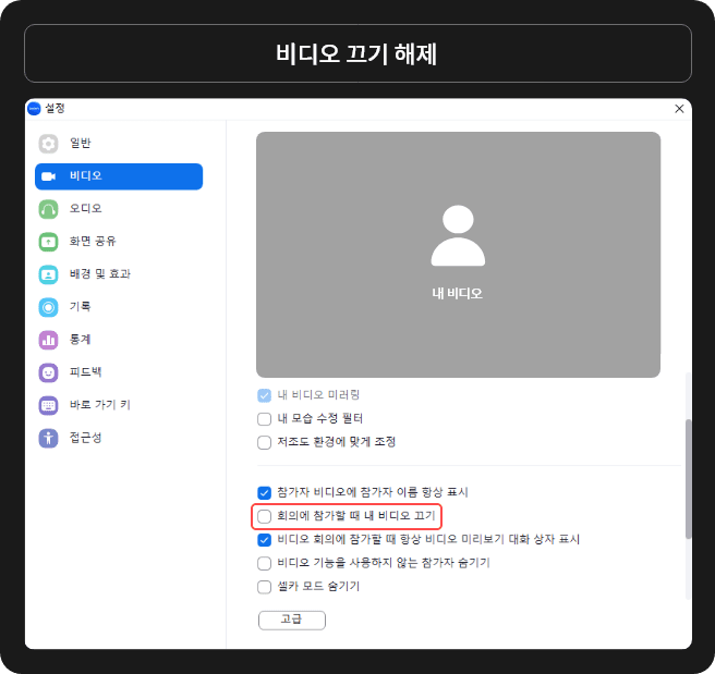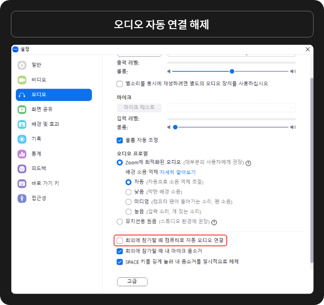 오디오 자동 연결과 비디오 끄기 해제를 해주세요.